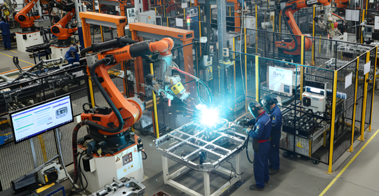 Advanced manufacturing infrastructure with robotic stamping and welding lines